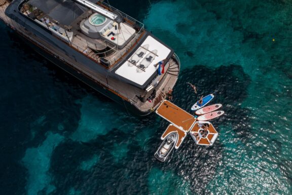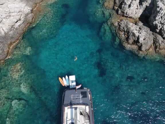 Measuring 33 meters, this small floating hotel offers accommodation and entertainment for up to 12 guests accommodated in 6 modern and well-appointed cabins with own ensuite cabins, 2 of them boasting more space. As most yachts in this category offer, water sports equipment deserves a special mention. Wave runner, water skiing, Ringo ride, snorkels, masks and much more will keep you entertained as, you visit different bays every day.