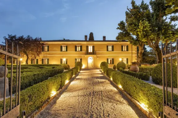 This recently restored historic estate set midway between Montepulciano and the Val d’Orcia, about 4 miles from town, offering exclusive use and 4,845 sq ft of interiors across two floors with 7 double bedrooms (each with its own bathroom), full air-conditioning, two elegant lounges with fireplaces, and two fully equipped kitchens—all framed by a half an acre Italian garden and a hydromassage mini-pool for post-tasting unwinds. Panoramic views sweep over vineyard-striped hills, making the property ideal for sophisticated gatherings up to 14 guests in a quintessential Tuscan setting.